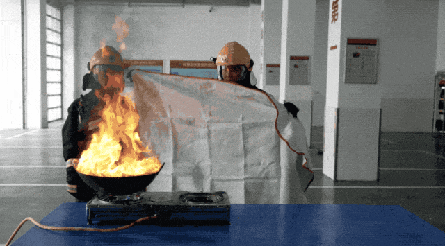 将灭火毯盖到油锅上,注意按压四周。此外,要从靠近身体的一侧向外铺开灭火毯,让灭火毯首先将人的身体与火焰进行隔离,避免引火烧身。