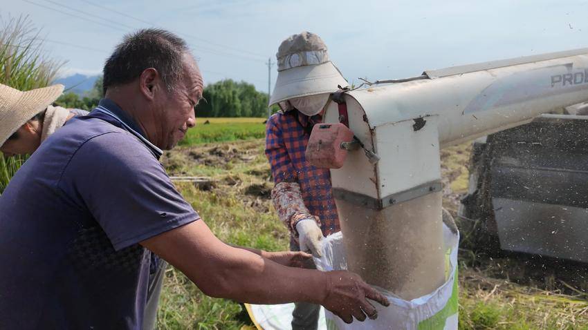 金黄稻浪翻滚,机声隆隆。9月17日,丰山镇丰新村的中稻田里,种粮大户们抢抓晴好天气开镰收割。