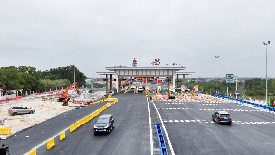 收费站周边,道路指示牌清晰明了,为过往车辆提供了准确的导航信息,而在一旁,收费站改扩建工程正稳步推进,大型机械设备轰鸣作响,呈现出一派井然有序的施工场景。