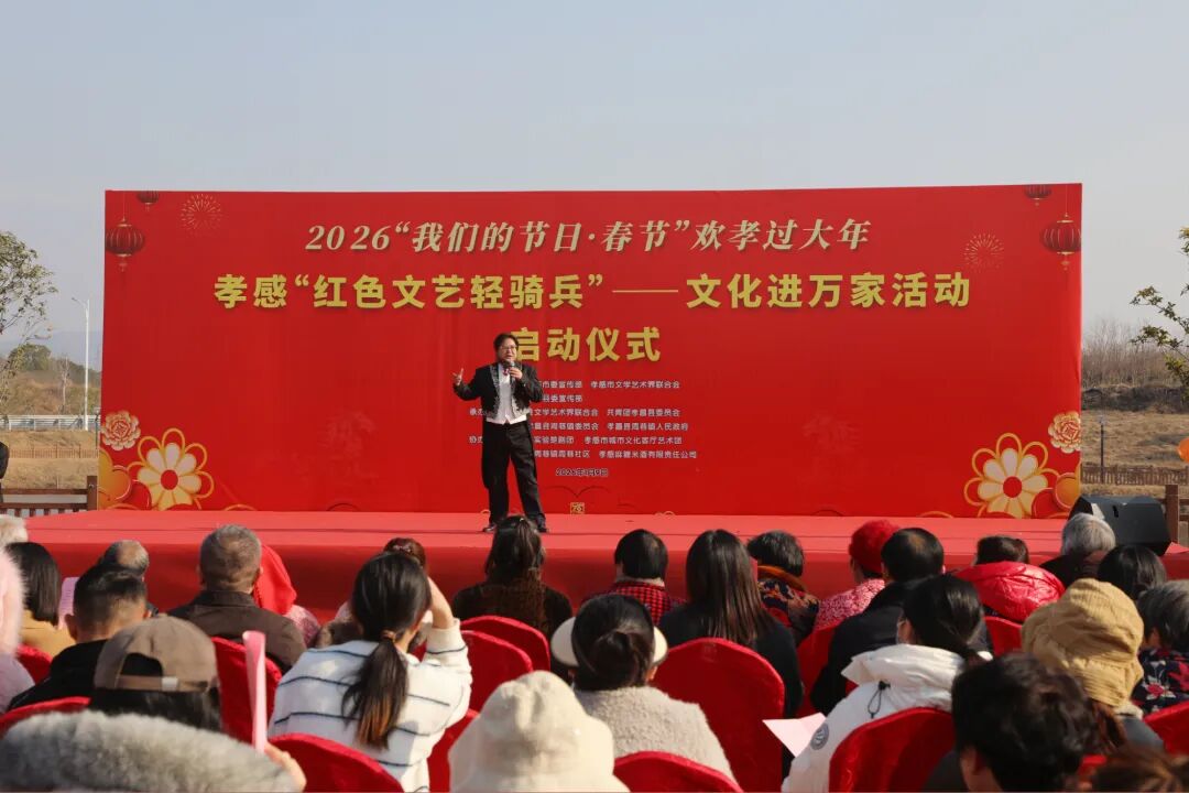 此次活动由中共孝感市委宣传部、孝感市文学艺术界联合会、中共孝昌县委宣传部联合举办,以“我们的节日·春节”欢孝过大年为主题,以荆楚“红色文艺轻骑兵”文艺演出、送春联、送福卡、年货赶集为主要活动形式,以文艺为桥传递党的关怀,营造欢乐祥和的节日氛围,丰富乡村百姓的精神文化生活,为乡村振兴注入精神动力。