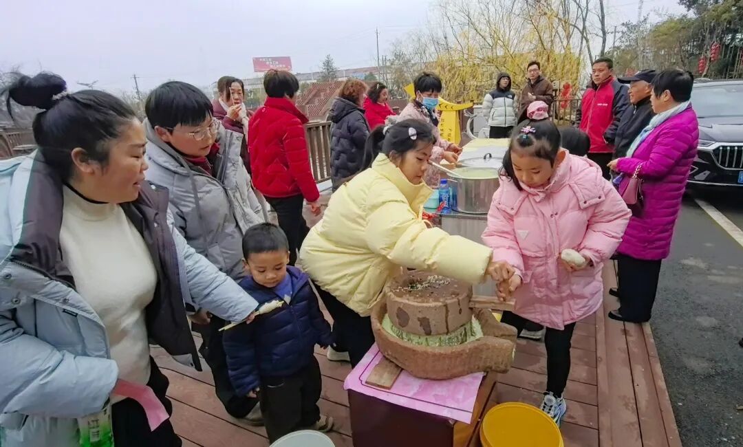 王店镇“戏韵下乡 爱满冬日”活动现场,游客体验打糍粑,采购年货。■通讯员邹圆圆 摄