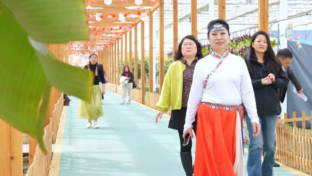 在占地10万平方米的九丰蔬菜时光智慧大棚里,立体栽培架上挂满金黄的小番茄、缤纷的彩椒以及悬垂而下的蛇瓜,令人目不暇接。游客们沉浸其中,一边拍照打卡,亲身感受科技与农业融合的奇妙;一边动手采摘,体验收获的愉悦。