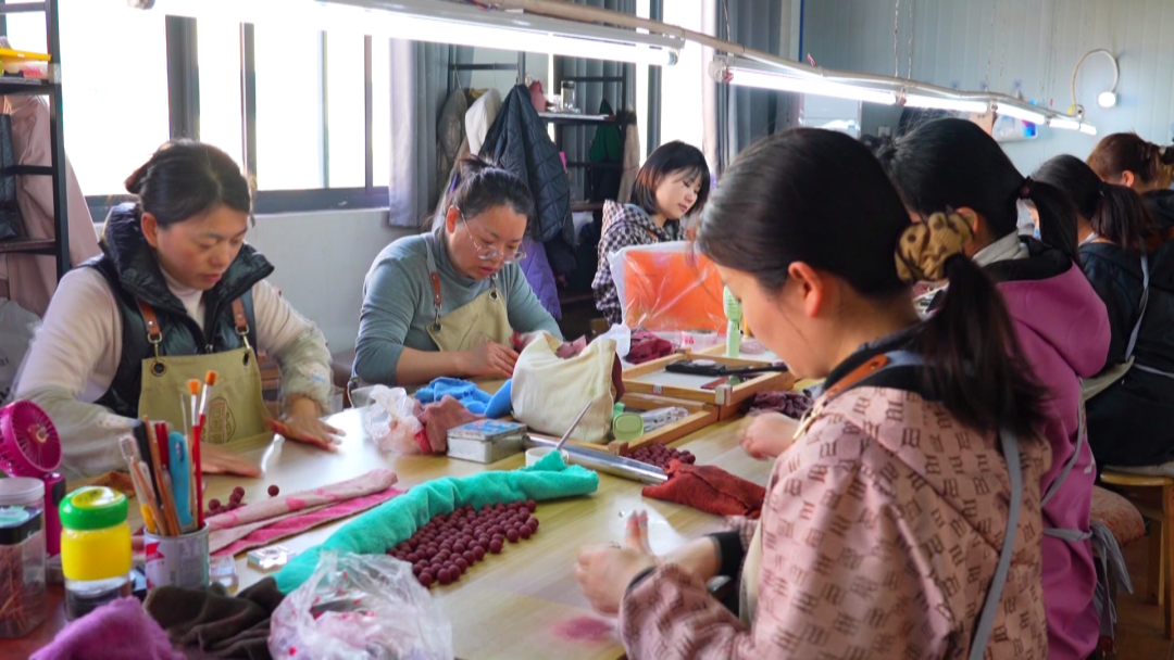 非遗活化催生“指尖经济”,非遗工坊扩至2000多平方米,带动150余名宝妈、留守妇女就近就业,实现顾家与增收双赢。
