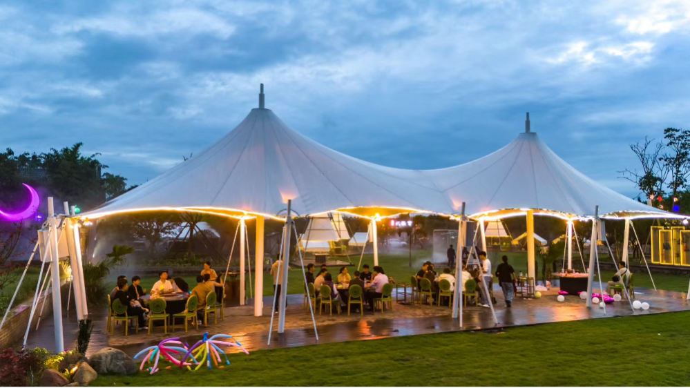 第三站,抵达大唐生态观光园·长乐营。园内油菜花铺展成金色田园,月季点缀其间,景致怡人。园区设有四川火锅烧烤、民宿、休闲娱乐设施,田园风光与休闲体验相融。