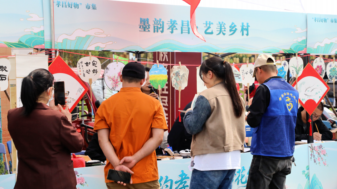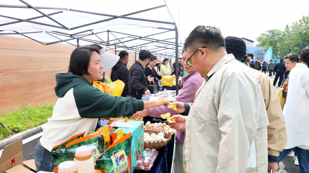 活动精心打造的“孝昌好物”市集成为一大亮点、周巷绿茶、邹岗太子米、马蹄爽、葡萄汁等优质本土农产品琳琅满目,游客们穿梭其间,挑选心仪好物。