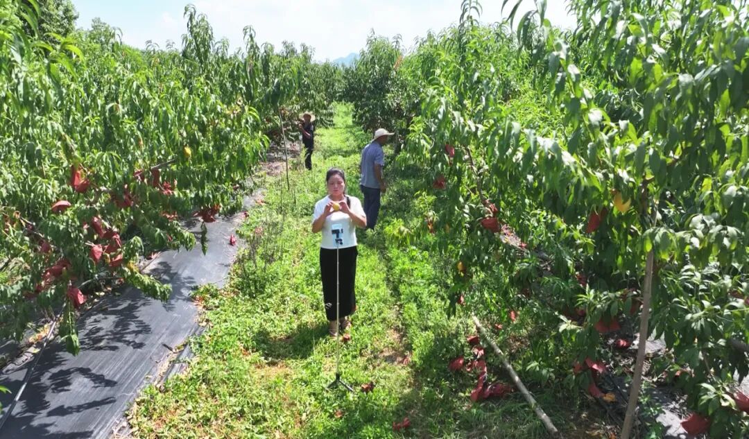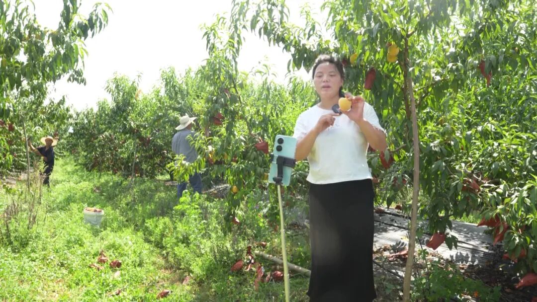 眼下正值黄桃上市的旺季,在孝昌县丰山镇红菱生态种植基地,电商达人李静正举着手机在桃林中穿行,通过直播间给网友们展示刚摘下的黄桃。