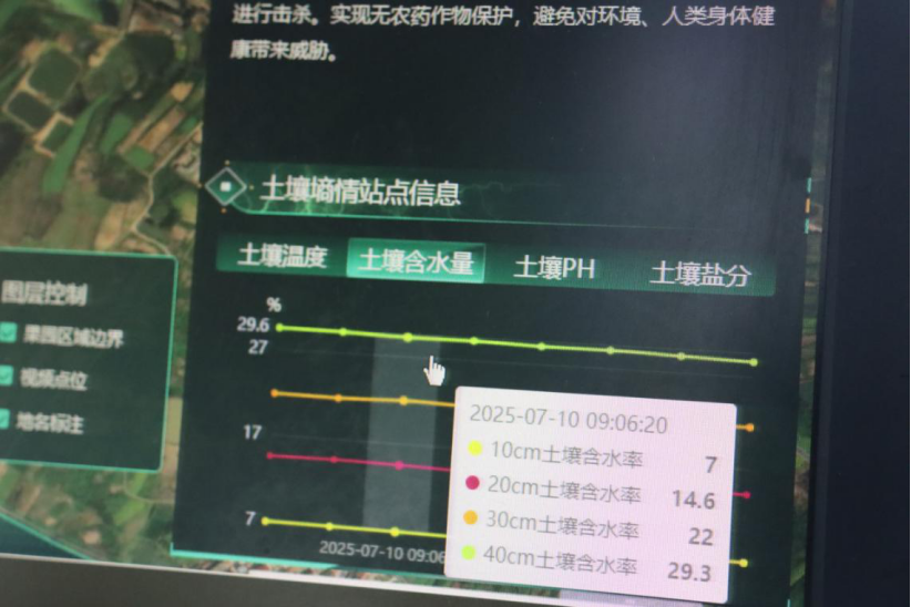 步入孝昌县红菱生态种植有限公司基地,传感器如“管家”般矗立在道路两侧,实时监测着温湿度和土壤墒情,桃树下的水肥一体化系统正在将水肥精准地滴灌至树根。红菱生态种植有限公司负责人杨杜斯介绍说,现在可以在电脑上为桃树浇水、施肥,并通过卫星遥感等技术实时监控,节约了人工成本。