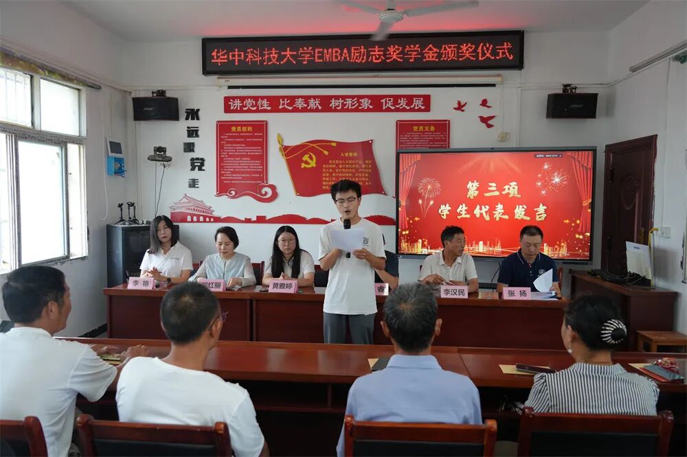 华中科技大学EMBA2024级学生作为捐赠方代表发言,介绍了EMBA学员募集善款设立该奖助学金目的,希望通过教育帮扶的方式支持乡村振兴,帮助更多东河村学子获得更好的教育机会,同时勉励全体获奖学生要心怀感恩,努力改变家乡面貌。