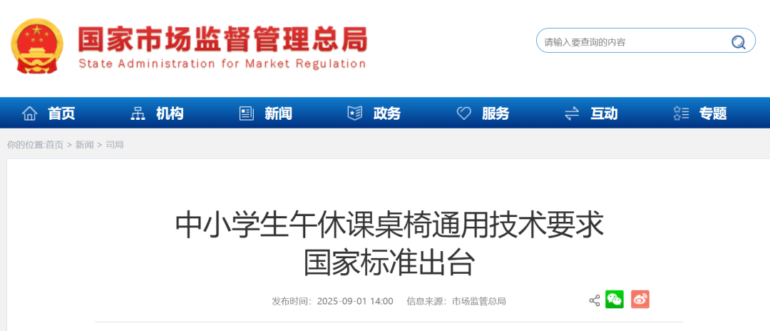 近日,国家市场监督管理总局(国家标准委)批准发布《中小学生午休课桌椅通用技术要求》(GB/T 46016-2025)国家标准,将于2026年2月1日正式实施。该标准根据学生身体发育特点,从设计、生产、检验、使用全流程作出规定,让午休课桌椅更舒适、安全、耐用。