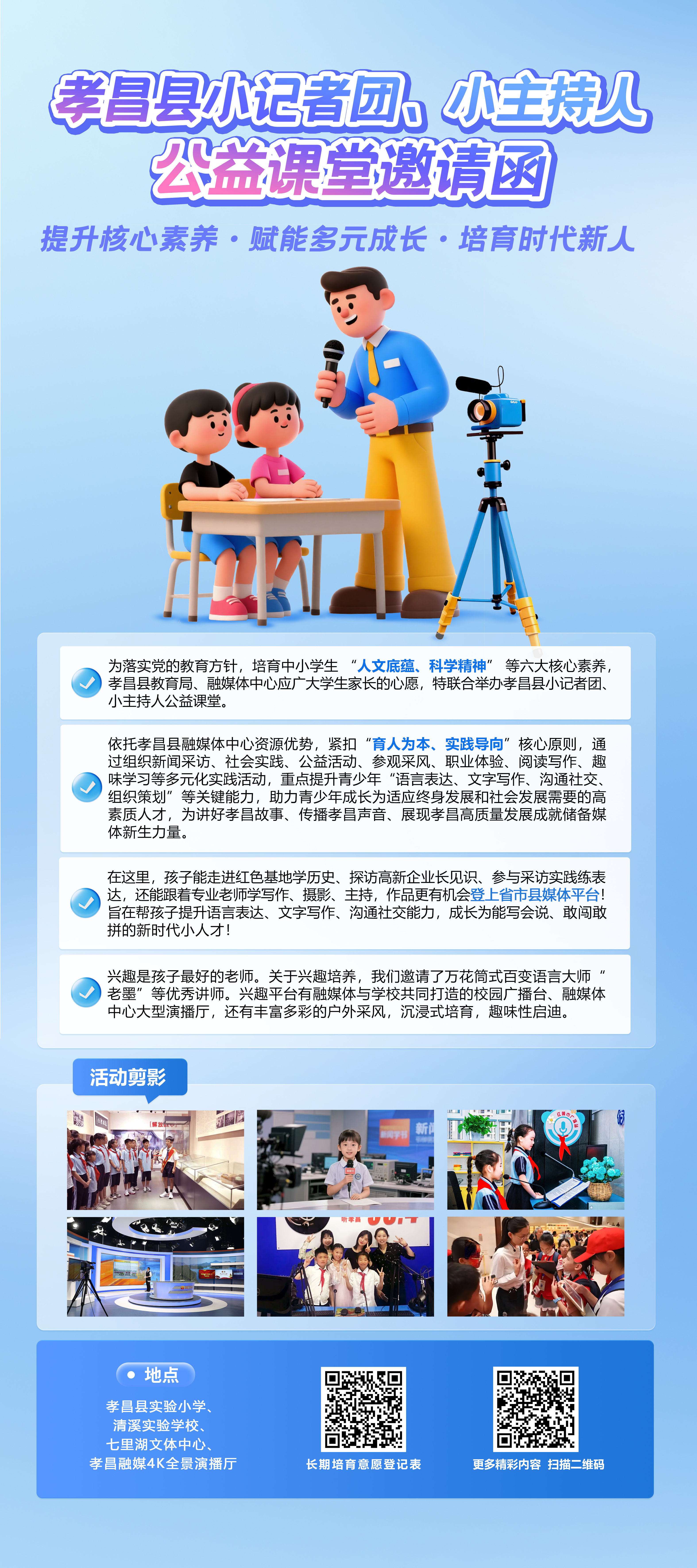 襄阳、武汉等地 小记者团小主持人风采 想让娃跟着 大咖学、去广电体验的家长 赶紧报名 1.点击下方链接或识别二维码报名: http://cloudforms.cjyun.org/h5/activity?id=1359 填写孩子姓名、年龄、家长电话; 2.有疑问找我们: 月亮老师:13377837009 小豆老师:15272783837 阿亮老师:15571209190