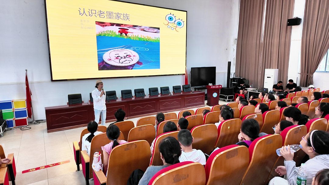 课堂上,讲师冷炳冰正用幽默诙谐的语气讲述了“老墨家族”的成长轨迹。冷炳冰(墨叔叔)曾任深圳市文联副主席、深圳音乐家协会副主席、深圳广播电影电视集团音乐台总监、主持人,少儿IP老墨家族创始人。课堂上,他以《小喇叭求学记》为题,结合自身实践,向学生及家长讲解表达方式的重要性。