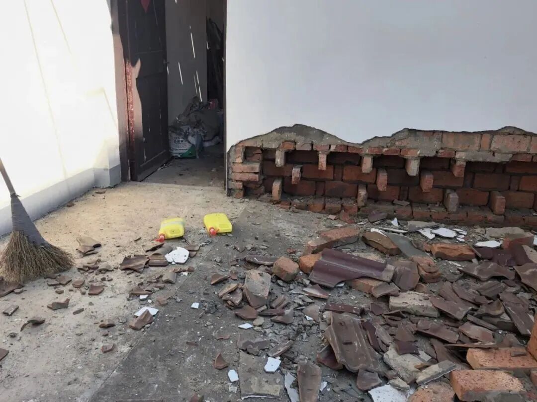 ▲被震破的墙体和掉落的瓦片
