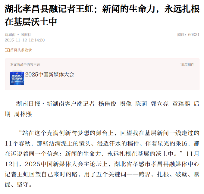 “站在这个充满创新与梦想的舞台上,回望我在基层新闻一线走过的11个春秋,那些沾满泥土的镜头、浸透汗水的稿件、伴着星光的采访,都在诉说着同一个信念:新闻的生命力,永远扎根在基层的沃土中。”11月12日,2025中国新媒体大会主论坛上,湖北省孝感市孝昌县融媒体中心记者王虹回望自己来时的路,用了五个关键词——跨界、扎根、破壁、赋能、坚守。