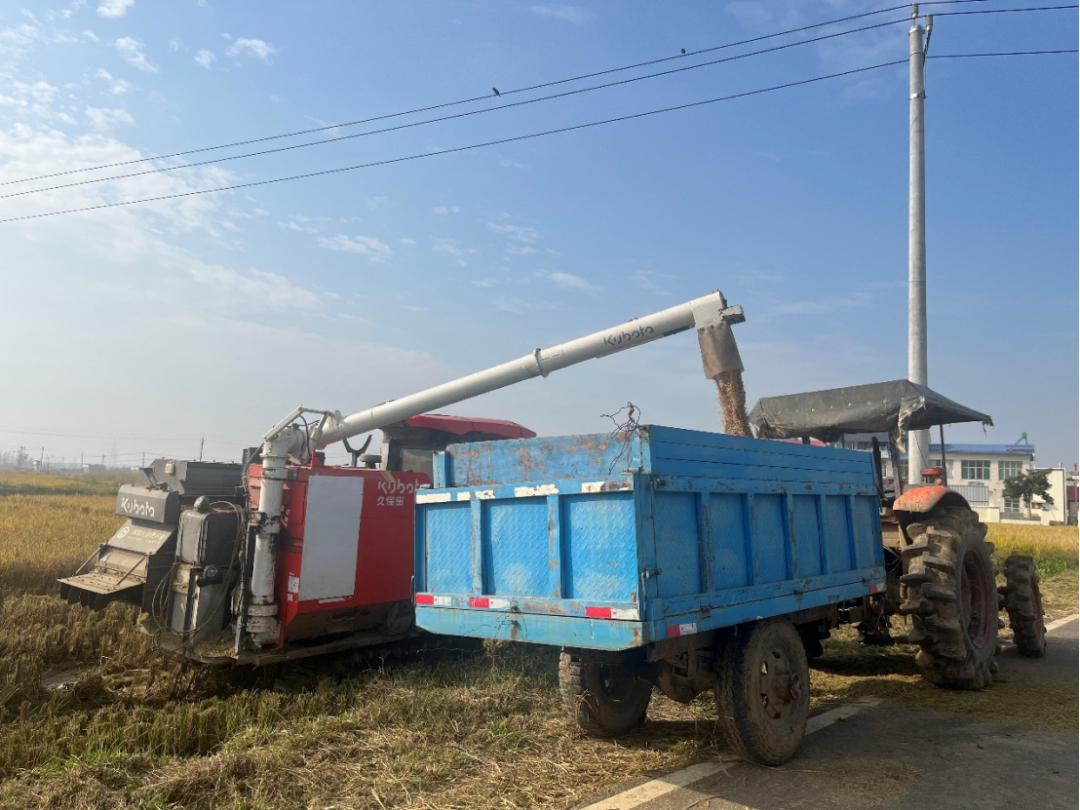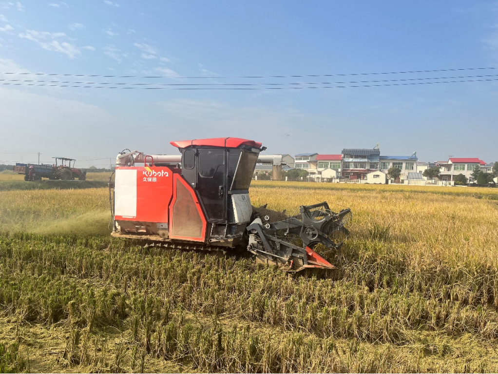 在邹岗镇群爱村,“全国粮食生产先进个人”付鹏程同样沉浸在丰收的忙碌与喜悦中。作为邹岗镇有名的太子稻种植大户,付鹏程流转、服务太子稻种植面积高达万亩。这几天,他合作社的几千亩太子稻正在同步收割,预计平均亩产达800斤左右。付鹏程笑着说:“以前人工收割靠‘人海战术’,现在机器一响,不仅劳动强度降了,稻谷损耗也少了,品质更有保障。”