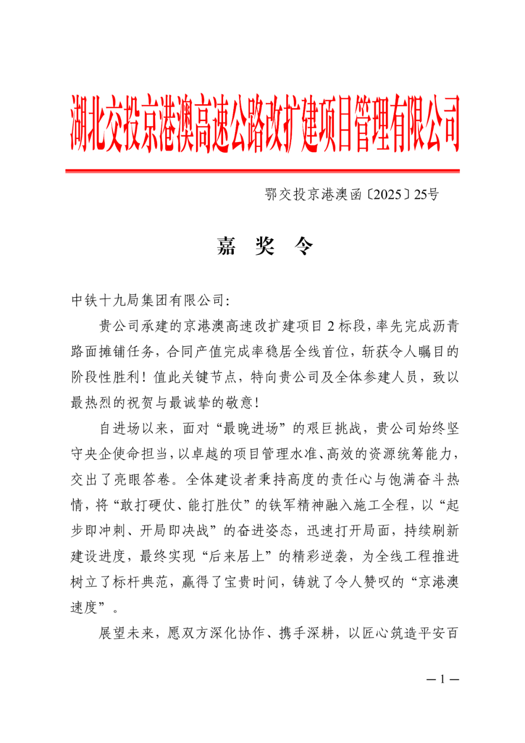 面对“最晚进场”的艰巨挑战,中铁十九局集团有限公司凭借卓越的项目管理、高效的资源统筹,率先完成沥青路面摊铺任务,合同产值完成率稳居全线首位,实现了“后来居上”的精彩逆袭,为全线工程推进树立了标杆,铸就了令人赞叹的“京港澳速度”。