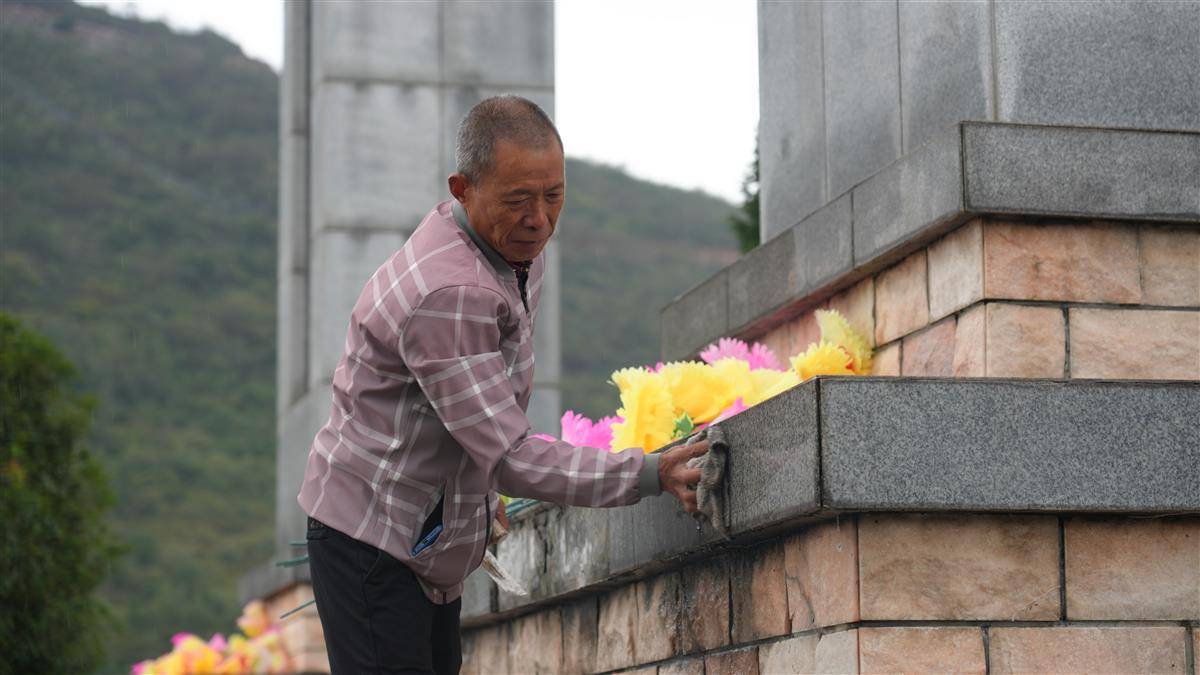 黄兰成在双峰英烈园擦拭烈士墓。(湖北日报全媒记者 方桐 通讯员 吴荣 杨艳容 摄)