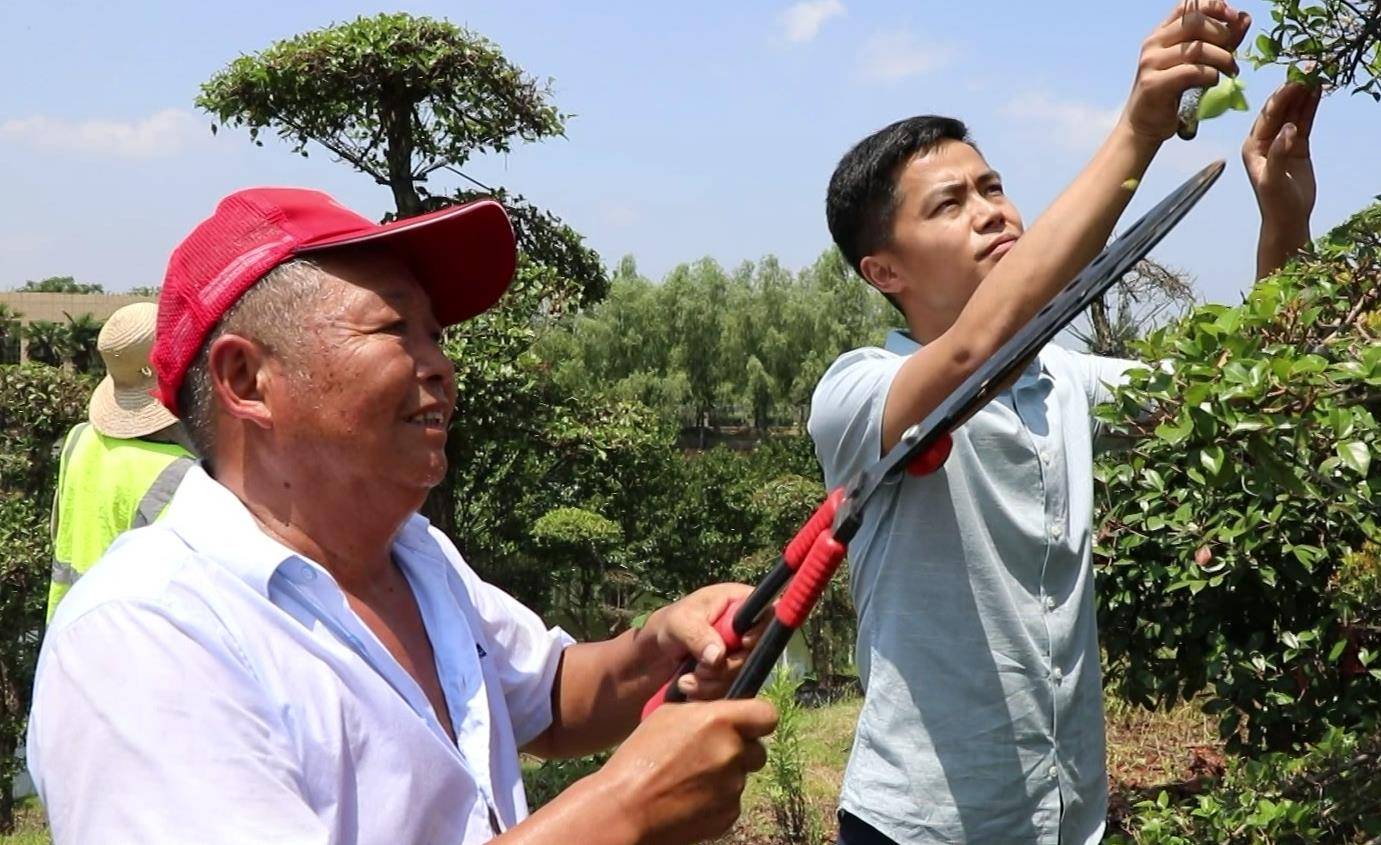 周巷镇90后党员沈腾(右一)在梦里花园苗木联合社基地修剪苗木。(通讯员 李文莉 摄)