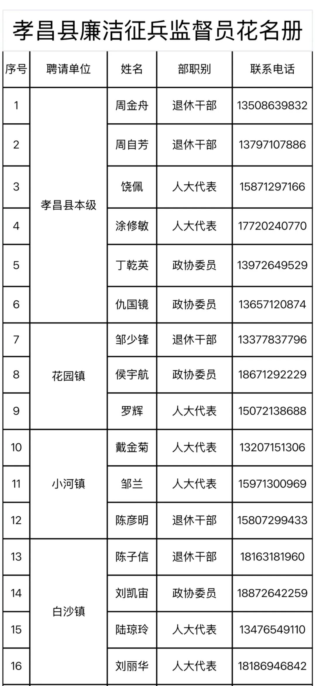为深入贯彻党风廉政建设有关要求,有效维护广大应征青年的合法权益,进一步增强征兵工作的透明度,确保征兵工作公平、公正、公开。根据上级有关要求,从全县各阶层聘请人大代表、政协委员、退休干部、高校教职工等类别人员担任廉洁征兵监督员。现将孝昌县廉洁征兵监督举报联系方式和监督员名单予以公示,欢迎社会各界对征兵工作进行监督。