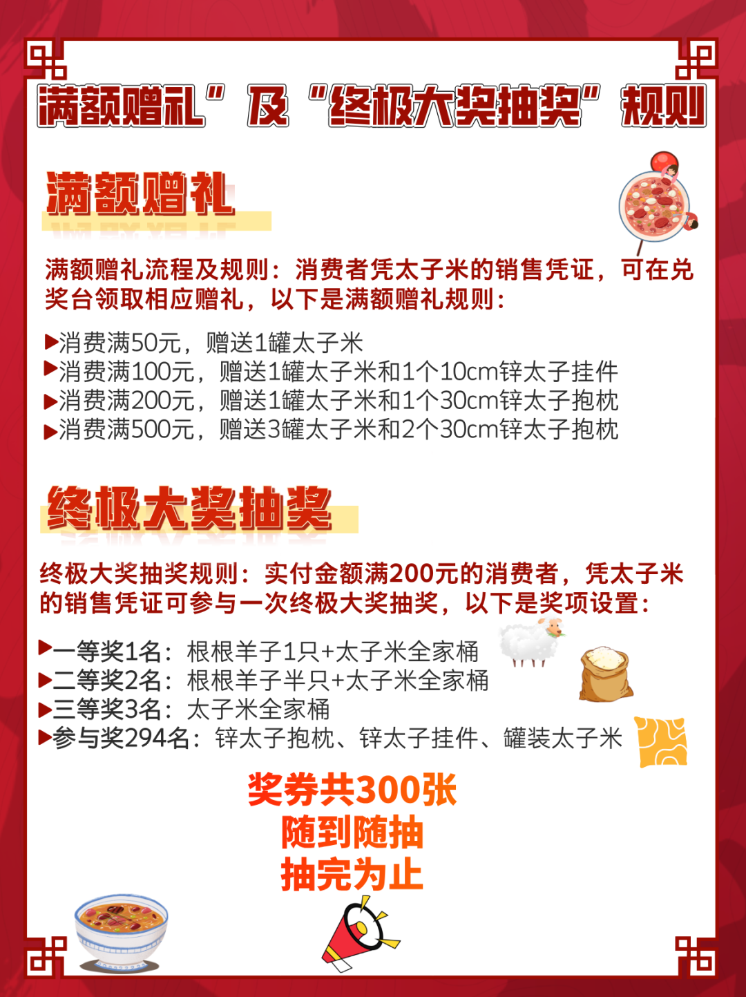 1.“锌”喜礼遇:多规格孝昌太子米和其他本土特色农产品(唐根根羊肉、茶叶、腊味、土鸡蛋、土猪肉等)展销,统一标价,推出“满额赠礼”活动。