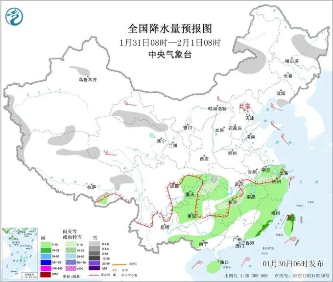 据中央气象台预报,今明两天(1月30日-31日),雨雪区域将逐渐南压,江苏、安徽、湖北、湖南等地将有小到中雪或雨夹雪,其中高海拔山区局地有冻雨;西南地区东部、江南、华南等地有小到中雨,局地大雨。其中30日雨雪影响范围较广,长江中下游沿线雨雪相态复杂,可能交替出现雨、雨夹雪、雪等降水相态,需重点关注对交通出行、城市运行的不利影响。