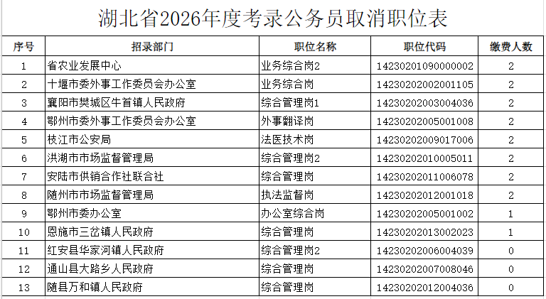 根据《湖北省2026年度省市县乡考试录用公务员公告》有关规定和报名缴费情况,全省共有13个职位因缴费确认人数不足3人予以取消。