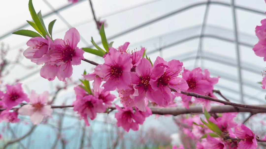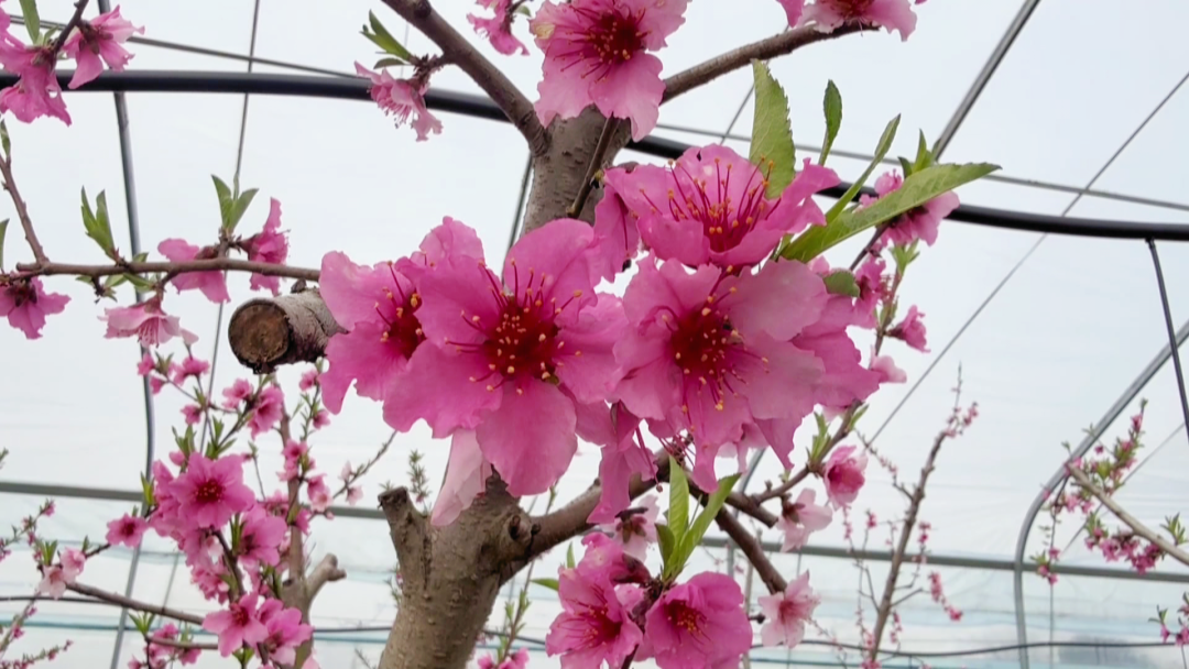 在孝昌县丰山镇昌丰生态园,智慧大棚内油蟠桃桃花竞相绽放,一株株桃花像“云霞”般婀娜多姿、娇艳动人,美不胜收。工人们穿梭在桃花丛中,手拿工具正在对桃花进行人工授粉,为增产增收打下良好基础。