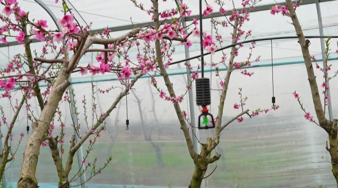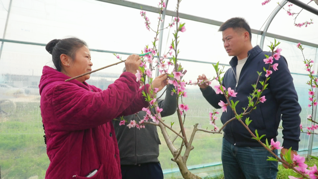 智慧大棚外又是一幅热火朝天的忙碌景象,技术人员正熟练地对桃树进行修剪,手中的剪刀仿若灵动的舞者,上下翻飞,精准地将枯枝、病枝以及生长过密的枝条一一去除。